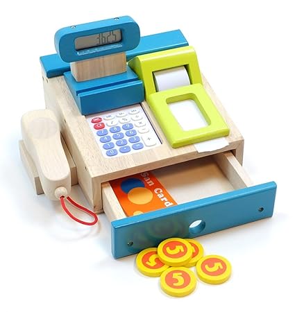 Spielkasse mit drückbaren Knöpfen und beweglicher Schublade für ein realistisches Spielgefühl Inkl. Mikrofon und Scanner und einer Halterung für eine kleine Papierrolle, die als Bon-Papier dient Inkl. vier Einkaufs-Karten für das Display der Kasse und Spielgeld in Form von Münzen und Scheinen Aus robustem Holz gefertigt Maße: 22 x 15 x 20 cm › Weitere Produktdetails
