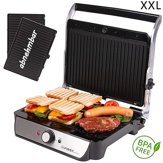 ?Multifunktional?4 in 1 Arbeitsplatte, für leckere Paninis, als Steak Grill, Sandwich Maker und als Röster. Einfach und schnell zur Abwechslungsreichen Küche. ?Große antihaft beschichtete Platten & Temperaturkontrolle? Super große 29.5x23.5cm2 Arbeitsplatte um alle Ihre Nahrungsmittel gleichzeitig zu Grillen. Dafür lääst sich der Deckel um 180 Grad öffnen. Antihaft beschichtete Platten mit einem Temperaturbereich von 230 -290 Grad. ?Edelstahlkörper & Aluminiumlegierte Platten? Das Edelstahlgehäuse sieht nicht nur Modisch, sondern auch Edel aus. Die Aluminiumlergierten Platten haben eine ausgezeichnete Wärmeleitfähigkeit und eine gleichmäßige Erwärmung. ?Abnehmbare Tropf Schale & LED Anzeige?Abnehmbare Tropfschale, einfach zu Reinigen. Spart dadurch wervolle Zeit. LED Anzeige zeigt das Erreichen der eingestellten Temperatur. ?Sicherheit?Für Fragen rund um unsere Produkte stehen wir Ihnen gerne zur Verfügung.