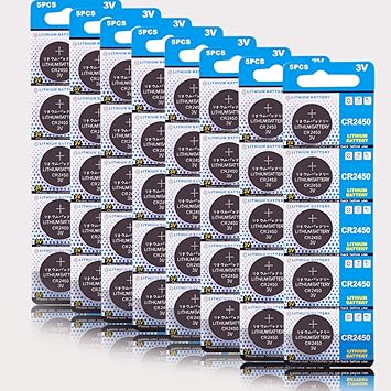 Typ: Nicht-Wiederaufladbare Lithium Batterie; Kapazität: 600mAh; Spannung: 3V Verwendet in Autoschlüssel, Haussicherheitssysteme, Fernbedienungsgeräte, elektronische Türschlösser und andere elektronische Geräte Bekannt als: CR2450N, DL2450, ECR2450, BR2450, BR2450-1W, CR2450N, KCR2450, LM2450, 5029LC 2 Blistercard a 5 Batterien insgesamt 10 Lithium Batterien Batteriegebrauch / -speicherung: Wenn Sie Ihre Batterien erhalten, bewahren Sie sie bitte in dem Original-Plastikbehälter auf, in dem sie geliefert wurden. Dadurch wird sichergestellt, dass sich keine Batterien berühren und dass die Batterien vor dem Gebrauch entladen werden