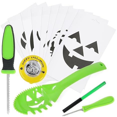 Set zum Kürbisschnitzen Inhalt: 2 Sägen, 1 Schaber, 1 Bohrer sowie 1 Kopierrädchen mit 9 gruseligen Vorlagen perfekt geeignet für Ihre Halloween Dekoration › Weitere Produktdetails