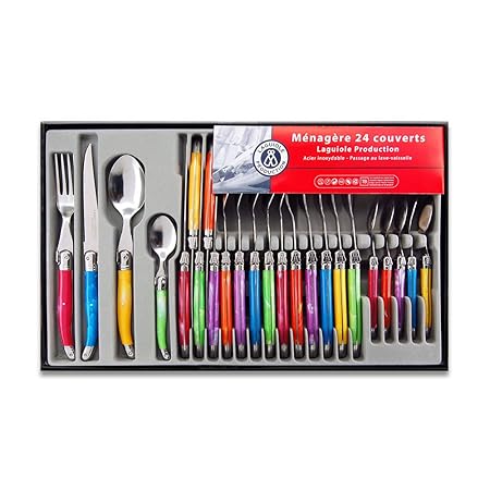 24-teiliges Besteckset aus rostfreiem Stahl. Mit mehrfarbigen Kunststoffgriffen. Jeder Teil ist mit der berühmten Laguiole-Honigbiene versehen. Das Set besteht aus 6 Messern, 6 Gabeln, 6 Löffeln und 6 Dessertlöffeln. Spülmaschinenfest. Hergestellt aus 1,8 mm dickem rostfreiem Stahl. Laguiole ist kein eingetragenes Warenzeichen. Das Wort 'Laguiole' ist ein allgemeiner Begriff, rechtlich nicht zu einer einzelnen Gesellschaft oder Ort der Herstellung beschränkt. Laguiole Style de Vie-Produkte werden in China mit sehr hohen Qualitätsstandards hergestellt.