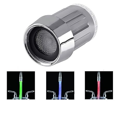 Dieses kleine Gerät passt auf die meisten Wasserhähne und lässt eine Reihe von LEDs leuchten, wenn Sie den Wasserhahn öffnen. 7 Farben werden gemischt automatisch, wenn Wasser fließt. Die Farben sind Grün, Rot und Blau. 'chroming, ausgezeichnete Korrosionsbeständigkeit, langlebig. Umwandlung des Stroms von Wasser in einen schönen Wasserfall des Lichts. Bietet Ihnen eine Freude und wunderbare Erfahrung. Ideal für Bad oder Küche durch ein.