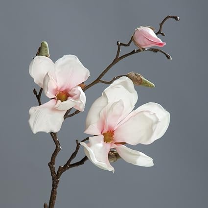 Eine künstliche Magnolie mit Blüten und Knospen. Farbe: Sehr leicht ROSA (fast weiß). Gesamtlänge ca 50 cm Blüten ca 8 - 13 cm. Knospe ca 3 - 4 cm. Blätter ca 3,5 - 5,5 cm. Durchmesser Stiel ca 5 - 8 mm. Der Stiel hat einen Kern aus Draht und kann gebogen werden.