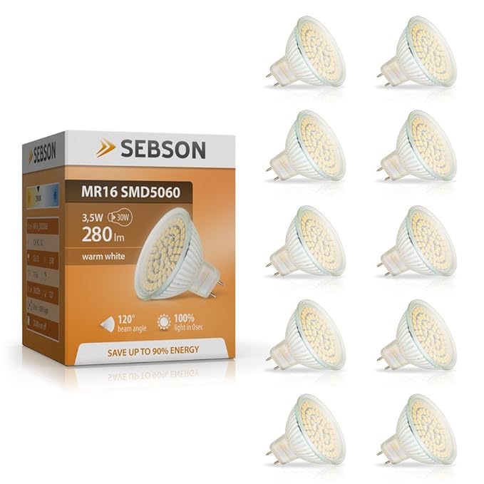SEBSON LED Leuchtmittel GU5.3/ MR16 12V mit einer Leistung von 5W und einer Helligkeit von 420 Lumen Diese GU5.3 LED Lampe dient als Ersatz für eine 35W Halogenlampe Der Abstrahlwinkel von 36° ermöglicht eine gezielte Objektbeleuchtung (Spotlight/ LED Spot) Die Energieeffizienzklasse von A+ ermöglicht ein Energieersparnis von bis zu 90% und die GU5.3 LED Lampe erreicht sofort ihre volle Leuchtkraft Diese GU5.3/ MR16 LED 5W Lampe hat ein angenehm warmweißes Licht mit 3000K › Weitere Produktdetails