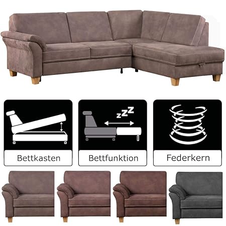 Hochwertig verarbeitete Eckcouch mit Bettfunktion und Bettkasten für Ihr Wohnzimmer. Der Longchair kann wahlweise rechts oder links montiert werden.