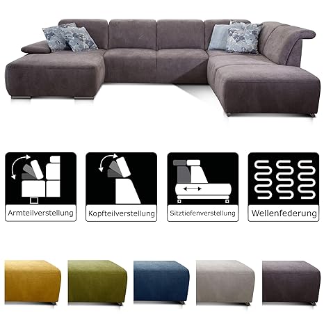 Abmessungen BxHxT: 280 x 75 x 90 cm / Sitzbreite: 230 cm / Sitzhöhe: 50 cm / Sitztiefe: 55 cm / Höhe Rückenlehne: 35 cm / Höhe Armlehne: 75 cm / Ottomane Tiefe: 155 cm Sitzbreite: 65 cm, Sitztiefe: 135 cm / Materialzusammensetzung des Bezugsstoffes: 100% Polyester (Microfaser)