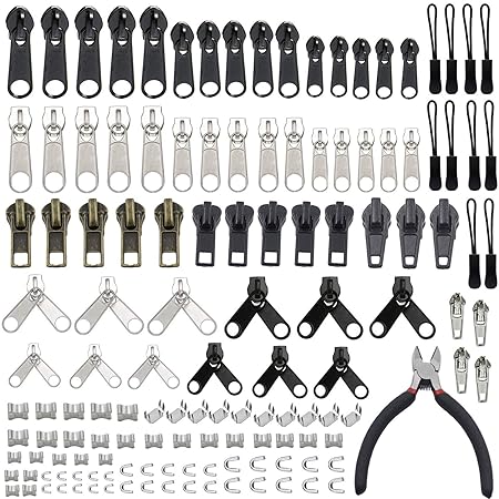 Nützliches Zipper Repair Kit. Enthält verschiedene Größen von Reißverschlussschieber, Boden- und Oberstopper, mit Hilfe der Zange können Sie Probleme mit dem Reißverschluss selbst beheben Multisized Sliders. mit 3 x Bandschiebern (3 #, 5 #, 8 #), 15 x schwarzen Schiebern (3 #, 5 #, 8 #), 6 x Doppelsplitterschiebern 5 #), 15 x unteren Korkenziehern (3 #, 5 # , 8 #), 30 x oberen Korkenzieher (3 #, 5 #, 8 #), nützlich zum Nähen Nähen. Zipper Install Zangen: Die Reißverschluss Zange Größe ist etwa 10,5x7 cm / 4,1x2,75 Zoll; Groß für die Installation von Reißverschlussstopfen, Passt für verschiedene Größen von Reißverschluss Weit verbreitet Anwendung: Bietet Ersatz Schieberegler häufig in verschiedenen Größen für die Reparatur von Kleidung, Taschen, Outdoorboxen, Jacken, Jeans, Jacken, Geldbörsen, Gepäck, Rucksäcke Nützliche Ersatz Zipper: Reißverschluss Reparatur Schieberegler gesetzt, um die gebrochene ersetzen, ist auch gut für andere DIY-Projekte