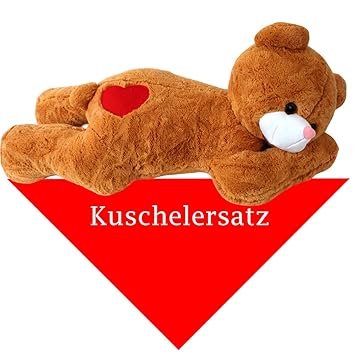 Dekorativer und schön designter Riesenteddybär im klassischen Braun mit aufgenähtem Herz, abgesetzter weißer Schnauze und Sicherheitsaugen. Als externes Zubehör ein rotes Tuch mit weißem Text Der XXL Teddy Bär 100cm ist aus hochwertigen Plüsch Stoff hergestellt und ist bis 30° waschbar, die Konformität entspricht der CE EN71 Richtlinie. Als liegender Kuschelteddy macht dieser Plüschbär in jeder Umgebung eine gute Figur und sorgt bei großen und kleinen Bärenliebhabern für Begeisterung Als Geschenk zu allen denkbaren Anlässen sorgt der XXL Teddybär bei Kindern als auch Erwachsenen für viel Dankbarkeit und Freude beim Schenken. Der hochwertige Riesenkuschelbär wird Ihnen von einem deutschen Händler aus Deutschland angeboten. › Weitere Produktdetails