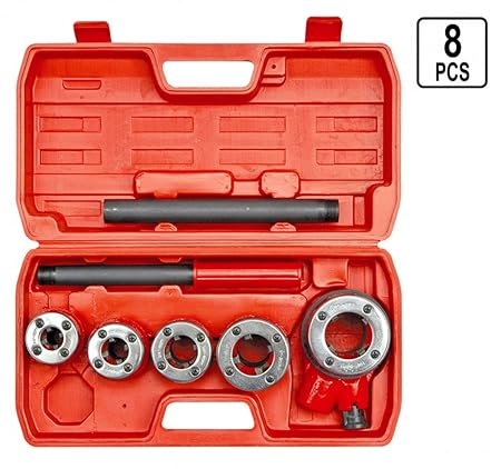 9-tlg Ratschenkluppe mit 2-teiligem Griff 6 Schnellwechsel-Schneidköpfe zum Schneiden von konischen Rohrgewinden Größen: 1/4', 3/8', 1/2', 3/4', 1', 1.1/4'