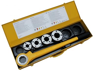 Schneidkluppensatz 8-tlg. Gewindeköpfe von 3/8 bis 1 1/4 Zoll Größen: 3/8' (10 mm); 1/2' (12.5 mm); 3/4' (19 mm); 1' (25 mm); 1 1/4' (32 mm) Grifflänge: ca. 42 cm › Weitere Produktdetails