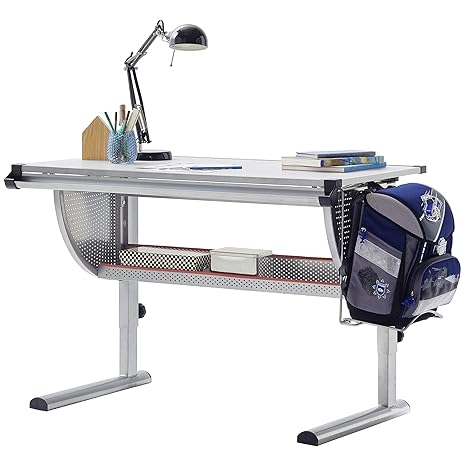 Schreibtisch Aufbaumaße: 110 x 73 cm (Breite x Tiefe), in der Höhe von 57 bis 76 cm verstellbar mit Rucksackhalterung - rechts oder links montierbar, Stiftablage und weiterer Ablage für Bücher, Hefte und mehr. Perfekt auch als Zeichentisch Jugendschreibtisch mit Schublade für weiteren Stauraum wie Malutensilien, Hefte, Farben usw. Platte neigungsverstellbar für bequemes Arbeiten Höhenverstellbar von 57 cm bis 76 cm, ideal für Grundschüler und eine Sorge weniger für Eltern da der Schülertisch einfach mitwächst Plastikkappen austauschbar in grau und rosa, somit perfekt für Mädchenzimmer wie auch für ein Jungszimmer