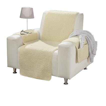 Der Sesselschoner ist in einem Stück gearbeitet. Er hat zwei angenähte Armlehnenschoner (40x60 cm), jeweils mit praktischen Seitentaschen für Brille, Fernbedienung etc. Er schützt ihn vor Abnutzung und erhöht den Sitzkomfort. Das praktische Wohnaccessoire in Wohlfühlqualität sorgt durch seine helle, natürliche Farbe für eine heimelige Atmosphäre. Im Handumdrehen verleiht der Sesselschoner Ihrem Lieblingssessel eine neue Optik. Lassen Sie sich von den hervorragenden Eigenschaften dieser hochwertigen Naturqualität verwöhnen. Sie fühlt sich wunderbar weich an, ist angenehm wärmend, atmungsaktiv sowie temperatur- und feuchtigkeitsausgleichend. Rundum mit dekorativer Bandeinfassung. Das Produkt besteht aus 100% Wolle. Handwäsche möglich.