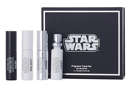 4 x 10 ml Disney Star Wars Duft Reise Set Eau de Perfum Box-Set. Leichte: eine reine, starke und erfrischende Tinktur. Dark: ein kräftiger, Dark Explosion der mystischen Düfte. Droid: eine pikante und florale Eau de Parfum Duft. Galaxy: eine würzige, pikante und Woody Eau de Parfum.