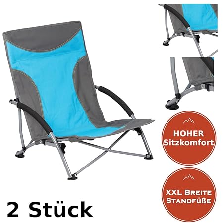 Set aus 2x Faltbarer Strandstuhl, extra stabil bis 120 kg belastbar, pulverbeschichtetes Stahlgestänge, robuster 600D Rip-Stop Polyester-Bezug Leicht tragbar in der mitgelieferten Transporttasche - Nur 2,9 kg Gewicht Kleines Packmaß 17x17x65cm für den einfachen Transport zum Strand Sitzbreite 58x48 cm, Sitzhöhe 22 cm, Rückenlehne (Höhe) 60 cm, gepolsterte Armlehnen Extra breite Standfüsse für weichen Boden und damit speziell gegen Einsinken am Strand