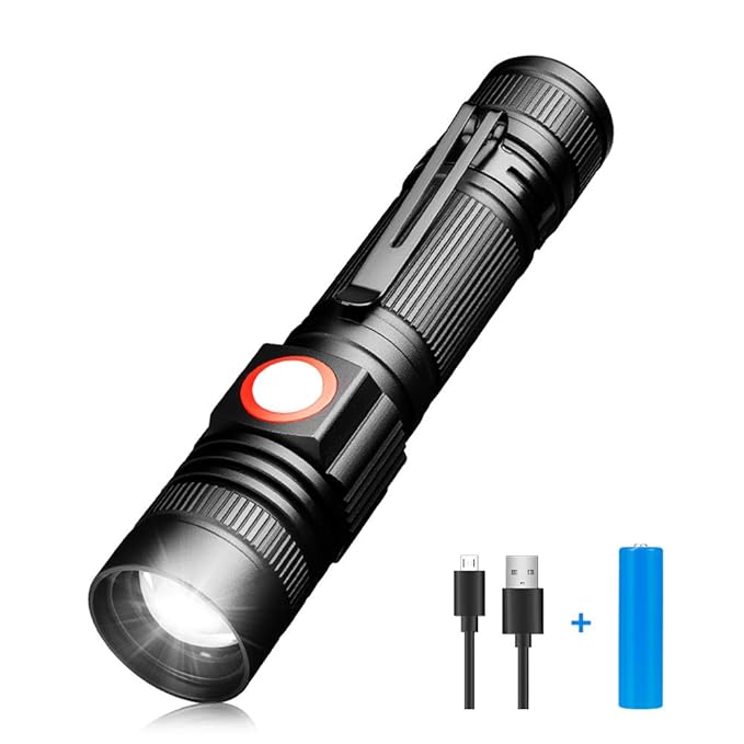 ?USB-wiederaufladbare Taschenlampe? Die LED-Taschenlampe ist mit wiederaufladbaren 18650-Akku ausgestattet. Sie kann mit einem USB-Kabel oder mit einem Netzteil von einem Laptop, einem Autoladegerät, einer Powerbank usw. Grünes Licht bedeutet voll aufgeladen, Rotes Licht bedeutet schwache Batterie. ?Praktische 4 Modi? 4 Modi: Hoch | Niedrig | Strobe | SOS. Drücken Sie den Knopf und halten Sie für ca. 4 Sekunden, um den Strobo-Modus zu wählen. Bitte beachten Sie, dass diese Taschenlampe keinen Speichermodus hat. ?Einstellbarer Zoom und Fokus? Die Taschenlampen stellen den Durchmesser des Lichts von oben ein und passen es durch Drehen im oder gegen den Uhrzeigersinn an. Wenn Sie anpassen, wird das Licht entweder kleiner und stärker fokussiert oder größer und weniger fokussiert, aber es wird in einem größeren Bereich beleuchtet. ?Tragbarer Metallclip?Taschenlampe hat ein kompaktes Design, ist leicht und durch ihre geringe Größe. Der kompakte Clip ist robust, so dass die Taschenlampe in Ihrer Tasche untergebracht werden. ?Weit Verbreitet & Garantie?LED Taschenlampe wird für Camping, Wandern, Angeln, Laufen, Hund Gehen, Stromausfälle, Notfälle, gezielte sucht und allgemeine Haushaltsnutzung verwendet. › Weitere Produktdetails
