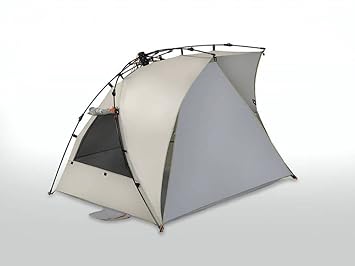 Nur 10 Sekunden Aufbauzeit (Quick-Up-System) - einfacher im Abbau als eine selbstaufbauende Pop-Up Strandmuschel Das Strandzelt mit zertifiziertem UV-Schutz (Lichtschutzfaktor 50+) bietet vor allem Kindern und Babys Sonnenschutz Das Zelt bietet im Vergleich zur Wurf-Strandmuschel sehr kompakte Packmaße von 70x12x12 cm (LxBxH) 2 Eingänge (mit Reißverschluss-Türen) und 2 Netzfenster sind verschließbar und bieten Windschutz Ein Baldachin im Dach (für Wertgegenstände etc.) und Sandtaschen machen es zum perfekten Sonnenschutz-Zelt