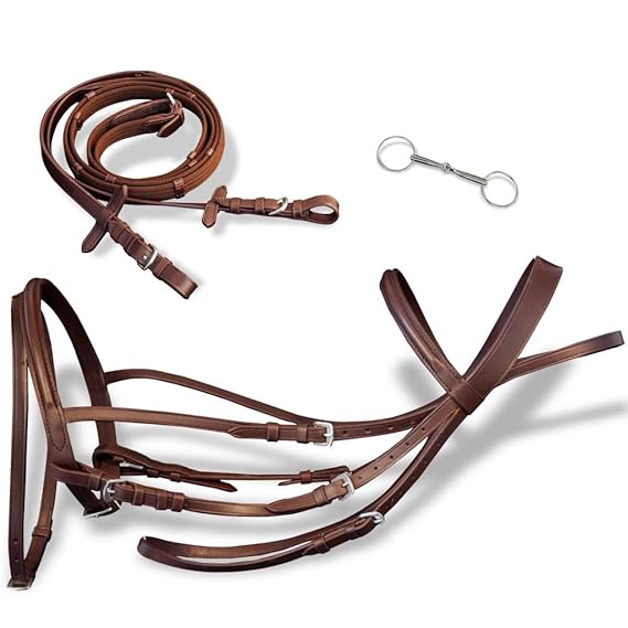 Aus bestem deutschen Qualitätsleder mit englisch-kombiniertem Reithalfter, beidseitig verstellbar Nasenriemen weich unterlegt Genickstück im Ohrenbereich ausgespart und gepolstert Lederstirnband. Abnehmbarer Sperrriemen Lieferung ohne Gebiss!