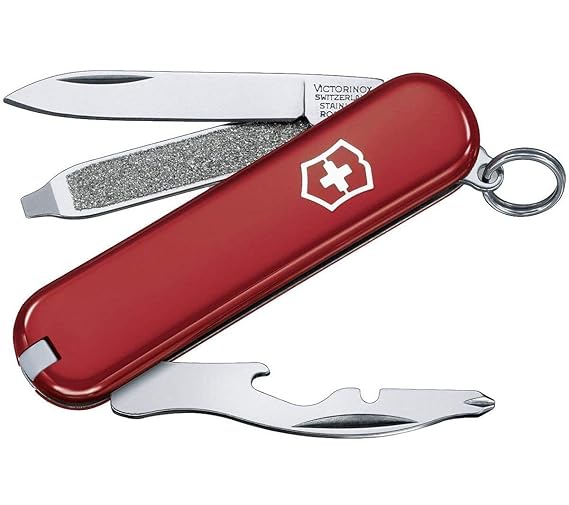 Ein kompaktes Werkzeug mit dem wichtigsten Zubehör. Hauptmerkmale: Schere, Nagelfeile mit Schraubendreher Taschenmesser mit 7 Funktionen, hergestellt in der Schweiz: Klinge, klein; Schere, Nagelfeile; Schraubendreher 2,5 mm; Schlüsselanhänger; Zahnstocher; Pinzette Abmessungen: Höhe 9 mm, Länge 58 mm, Gewicht 22 g. Schalenmaterial: ABS / Cellidor. Artikelnummer: 0.6223. Artikelname: Classic SD