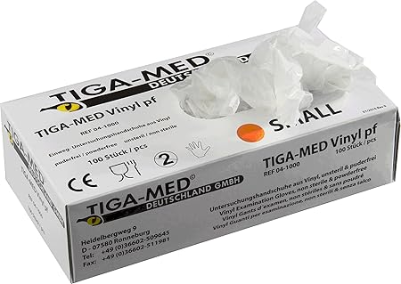Original TIGA-MED Vinylhandschuhe - Box à 100 Stück Größe: Large elastisch, reißfest, puder- und latexfrei Exzellente Passform, AQL 1.5 Bereits ab 75 Euro Bestellwert liefern wir alle bei TIGAZON gekauften Artikel innerhalb Deutschlands komplett versandkostenfrei!