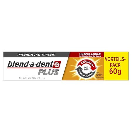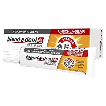 Blend-a-dent Plus Premium Haftcreme mit leichtem Minzgeschmack bietet die beste Haftkraft in der gesamten Blend-a-dent Produktfamilie Unschlagbarer Halt innerhalb des Blend-a-dent Sortiments: bis zu 88 % Halt am Ende des Tages 10 x stärkerer Halt durch die Anwendung von Haftcreme Starker Halt: verhindert den ganzen Tag lang, dass die Zahnprothese verrutscht Erhöhter Tragekomfort: Bildet ein Polster zwischen Zahnfleisch und Zahnprothese
