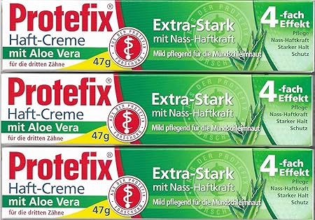 Protefix Haft-Creme mit Aloe Vera für ganztägige Sicherheit: Die Haft-Creme überzeugt mit extra starkem Halt Haft-Creme mit praktischer Nass-Haftkraft: Die Protefix Haft-Creme wird direkt auf die feuchte Prothese aufgetragen und hält dadurch sofort Dank der effektiven Randabdichtung verhindert das Haftmittel das Eindringen von Speiseresten unter die Prothese / Für unbekümmerte Sicherheit bei den dritten Zähnen Dank des natürlichen Inhaltstoffs Aloe Vera wird die Mundschleimhaut mild und angenehm gepflegt Lieferumfang: 2 x Protefix Haft-Creme mit Aloe Vera / Haft-Creme für mehr Sicherheit den ganzen Tag / Haft-Creme mit 2 x 47 g Inhalt