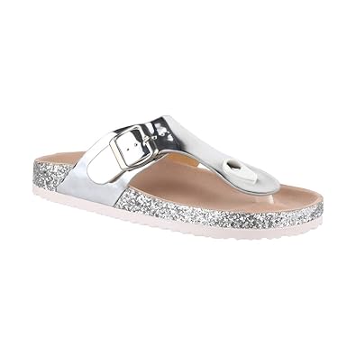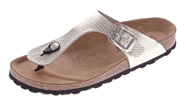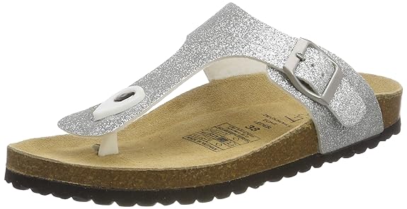 Le Clare Lilly Cyborg - Damen Zehentrenner-Sandalen Pantoletten mit anatomischen Fußbett aus Naturkork – Farbe: Silber Glitze