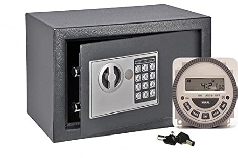 Der Tresor besitzt einen installierten Timer, der wöchentlich programmierbar ist. Der Benutzer hat so die Möglichkeit Zeitintervalle festzulegen, die das Öffnen des Tresors steuern. Der Timer verfügt über 8 programmierbare Ein/Aus-Ereignisse pro Tag und 15 Tages-Kombinationen, die bestimmen, wann Sie den Tresor öffnen können. Zum Beispiel: nur von Freitagabend bis Sonntagabend, jeden Tag nach 20.00 Uhr, vor 07.00 Uhr, oder wieder von 16.00 Uhr bis 18.00 Uhr, usw. Die kürzeste Sperrzeit des Timers beträgt 1 Minute, die längste 1 Woche. Wenn der Timer auf AUTO gestellt ist, können Sie den Tresor durch die Eingabe des von Ihnen eingestellten Codes öffnen, natürlich nur wenn Sie in dem eingestellten Zeitrahmen liegen. Wenn der Timer auf OFF gestellt ist, kann der Tresor durch Eingabe des von Ihnen eingestellten Codes nicht geöffnet werden. Wenn der Timer auf ON gestellt ist, können Sie den Tresor durch die Eingabe des richtigen Codes jederzeit öffnen (wie ein „normaler“ Tresor). Der Tresor wird mit einer bestimmten Anzahl an zusätzlichen Codes ausgeliefert um den Tresor im Notfall zu öffnen. Dieser Safe funktioniert nur mit 4 AA-Batterien. › Weitere Produktdetails