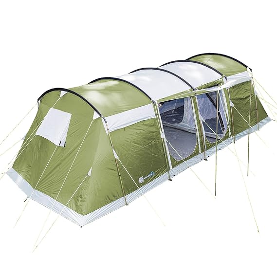Riesiges 8-Personen Campingzelt mit drei Eingängen und drei Innenzelten mit atmungsaktivem Stoff und eigenem eingenähten Boden und Moskitonetz für Insekt- und Zugluftfreier Schlafkomfort Großes Familienzelt mit vielen funktionalen Extras wie z.B. Lampenaufhängung, Kabelöffnung, Belüftungsöffnungen und einem Eingang, den man als Sonnensegel nutzen kann Geräumiges 8-Mann Zelt mit einer bequemen Stehhöhe von 200cm, reichlich Platz im Wohnbereich für Gepäck und Freunde und drei großzügigen Schlafkabinen: Zwei für jeweils zwei Personen und eine größere für vier Personen, die aber mit einer praktischen Trennwand auch unterteilt werden kann für einen erholsamen Schlaf Hell und Licht durchflutet bietet das großzügige Zelt viel Bewegungsfreiheit und die fast senkrechten Seitenwände erlauben eine komplette Ausnutzung der Bodenfläche. Der mitgelieferte Zeltboden für den Wohnraum ist als Wanne geformt, um Feuchtigkeit fern zu halten und für mehr Komfort zu sorgen Hohe Sicherheit mit feuerfestem Zeltmaterial und wetterbeständig mit 5000mm Wassersäule und hochwertig versiegelten Nähten. Schnell und einfach aufzubauen. Komplettes Zubehör einschließlich robuste Tragetasche, Erdnägel, Aufbauanleitung und Reparaturkit