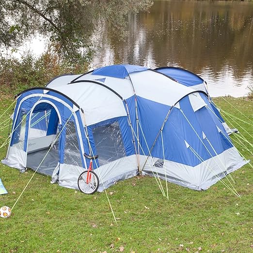Riesiges 6-Personen Campingzelt mit drei Schlafkabinen - jede mit eigenem eingenähten Zeltboden und schützendem Moskitonetz für Insektenfreie Nächte Gut durchdachtes Familienzelt mit vielen funktionalen Extras wie z.B. Lampenaufhängung, Belüftungsöffnungen und ein Eingang, den man als Sonnensegel nutzen kann Geräumiges 6-Mann Kuppelzelt mit einer bequemen Stehhöhe von 195cm, viel Platz im Wohnbereich für Gepäck und Freunde und drei Innenzelten für einen erholsamen Schlaf Schnell und leicht aufzubauen und trotzdem robust und stabil. Besonders witterungsbeständig mit wasserabweisendem Außenzelt mit 3000mm Wassersäule und qualitativ hochwertig mit verstärkten Nähten Ideal für sechs Freunde im Urlaub oder auf einem Festival, oder für neun Kinder bei der nächsten Party im Garten. Komplettes Zubehör einschließlich Zeltboden, Erdnägel, Aufbauanleitung und Reparaturkit