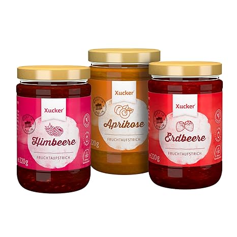 Leckeres Fruchtaufstrich-Set aus 1x Himbeere, 1x Aprikose, 1x Erdbeere mit Süßungsmittel Xylit, Früchte jeweils 74%, Made in Berlin Gesünder genießen: Nur geringe Blutzuckerspiegel-Erhöhung, Frei von Stevia, Aspartam und Acesulfam-K, Vegan, Ohne Zusatz von Konservierungs-, Aroma- und Farbstoffen, Beliebt bei Diabetikern Optimal bei kohlenhydrat-bewusster Ernährung, Ideal für ein gesundes Frühstück, in Desserts und zum Naschen Lieferumfang: 3 x 220 g Glas Xucker Fruchtaufstriche mit Xylit in Sorten: Himbeere, Aprikose, Erdbeere; Übermäßiger Verzehr kann abführend wirken, Von Tieren fernhalten › Weitere Produktdetails